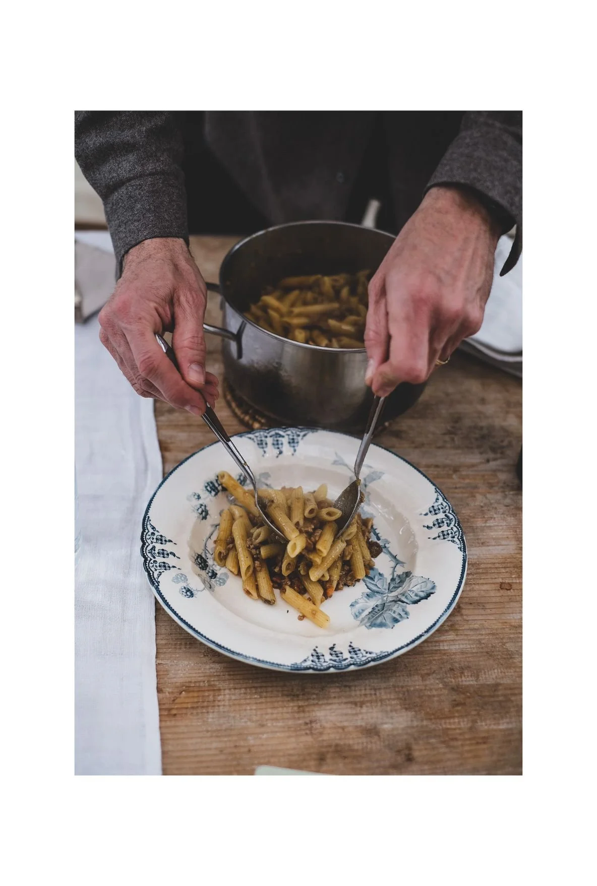 We photograph non-stop. Me on the upper terrace overlooking the Tuscan landscape. The sun is falling on the cypress trees. A hurried cyclist with his dog somewhere in the background. Paolo and Irene are in one of the rooms on the ground floor, nailing on the wall, painting, and preparing for the new season. It’s nearing one o’clock in the afternoon and we are hungry. In a split second Irene puts some amazing homemade casarets in the pot and Paolo makes a sauce that blows my mind. I put the camera down and walk down the stairs like a little kid. Two by two my steps. I’m tempted to fall, but I don’t care. The smell is driving me crazy and I remember my grandmother in Greece in August when I visited her she was making my favorite food and calling me to come down to the garden to eat in the sun.